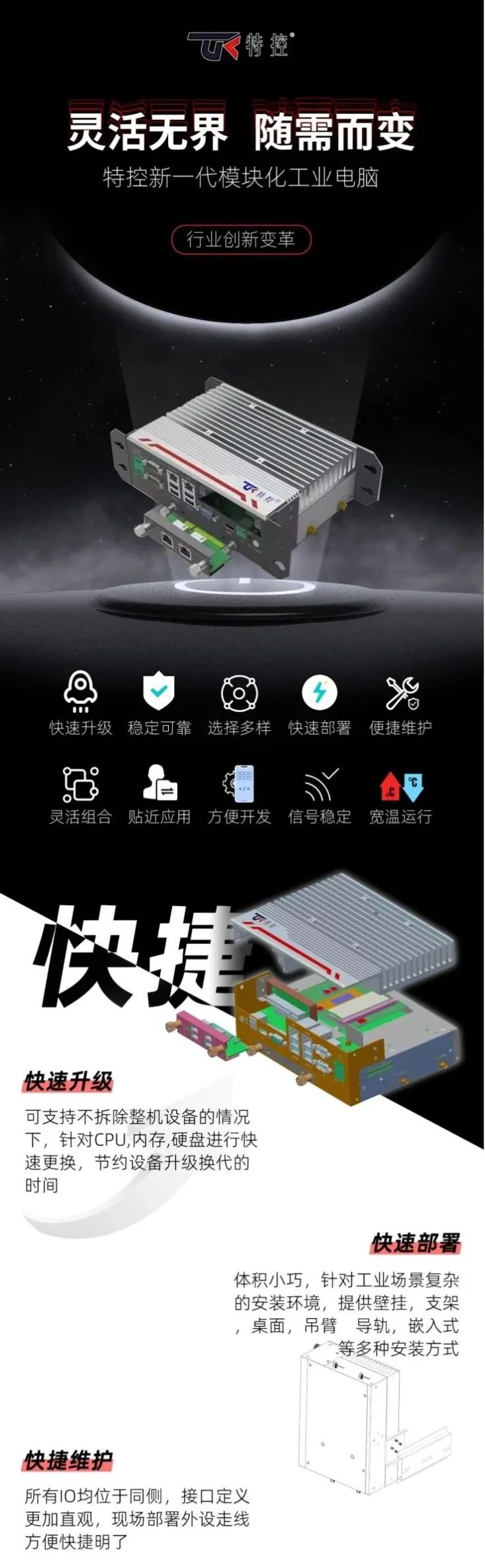 靈活無界,隨需而變,特控新一代模塊化工業(yè)電腦,行業(yè)創(chuàng)新變革。快速升級、穩(wěn)定可靠、選擇多樣、快速部署、便捷維護、靈活組合、貼近應用、方便開發(fā)、信號穩(wěn)定、寬溫運行。